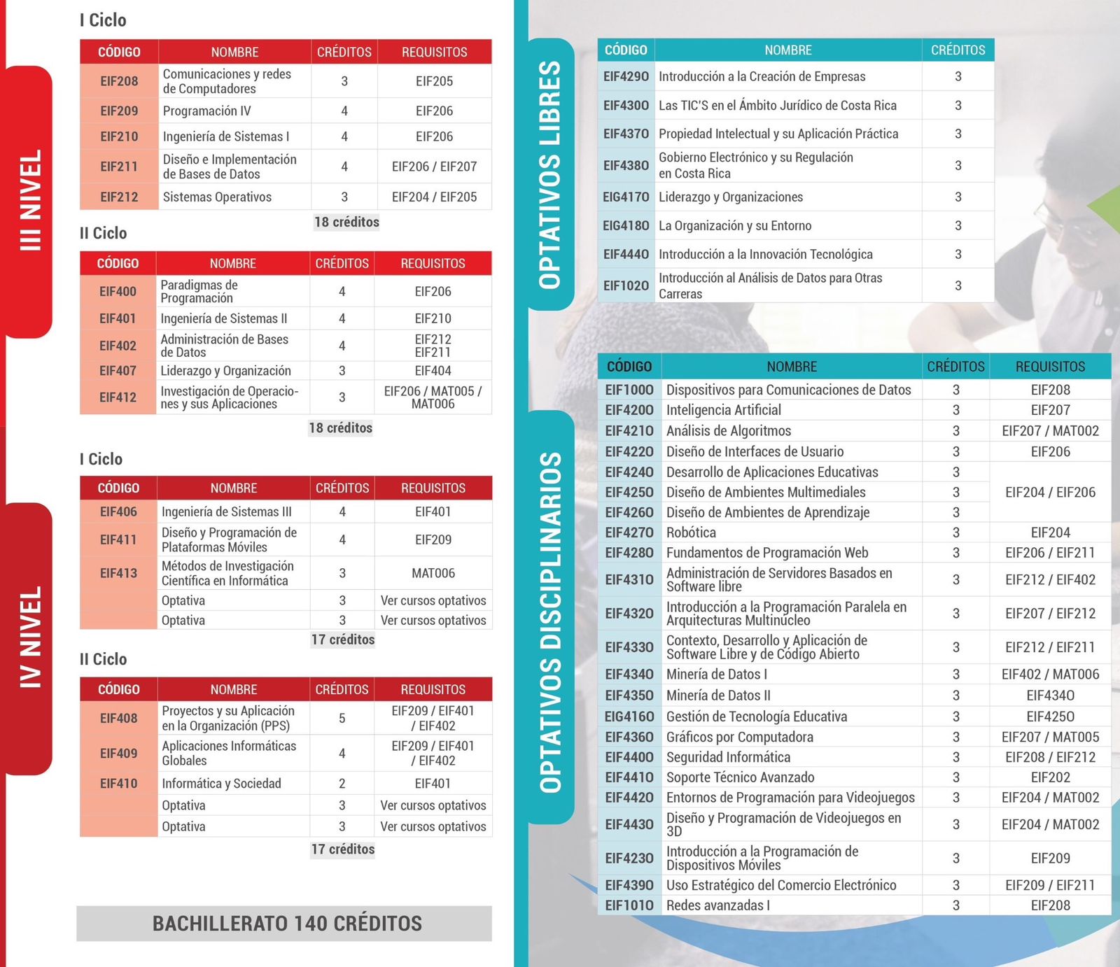 En el caso de grado bachillerato, el plan lo componen 41 cursos y 140 créditos, incluidos los cursos del diplomado, para una duración de cuatro años.